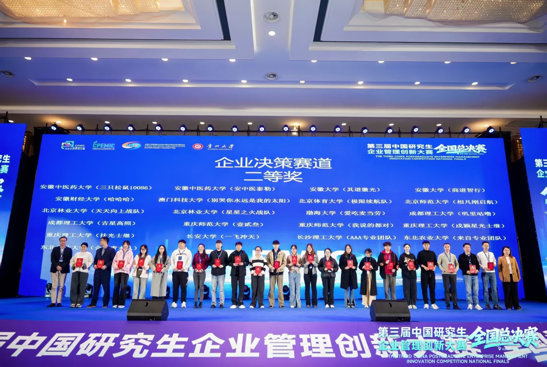 2025年11月8日至9日,第三届中国研究生企业管理创新大赛全国总决赛(以下简称大赛)在贵阳圆满举行。由李欲晓副教授担任指导老师,MBA教育中心孟嘉老师带队,2025级MBA郭一凡、张钧相、王刚3名同学组成“相凡刚启航”代表队,获得企业决策赛道MBA组全国二等奖,学院获得本次大赛的优秀组织奖。