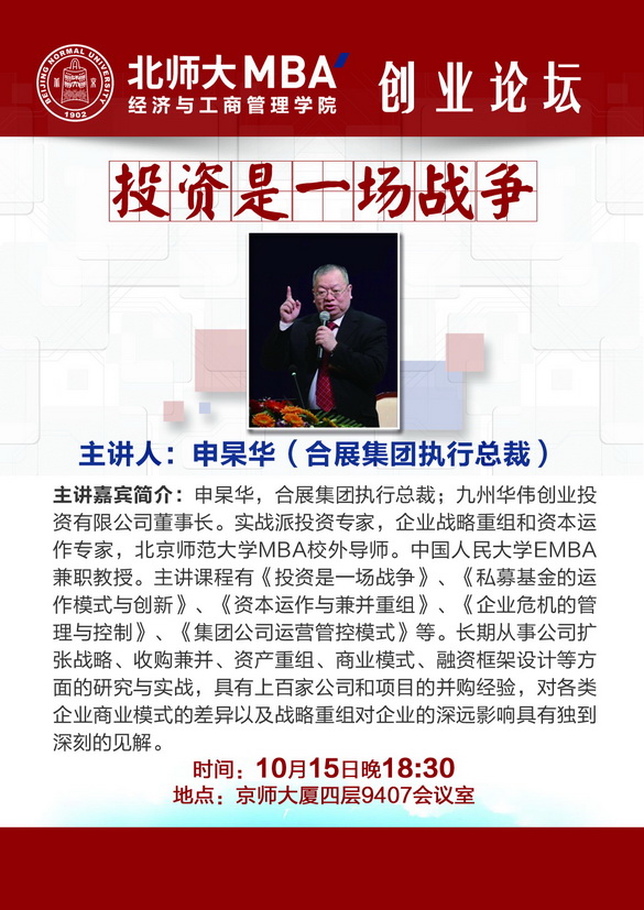 【创业论坛预告】北师大MBA创业论坛第二讲——投资是一场战争
