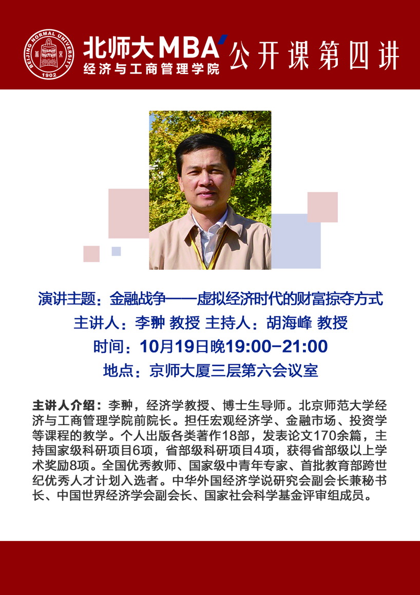 主讲人介绍:李翀,经济学教授、博士生导师。北京师范大学经济与工商管理学院前院长。担任宏观经济学、金融市场、投资学等课程的教学。个人出版各类著作18部,发表论文170余篇,主持国家级科研项目6项,省部级科研项目4项,获得省部级以上学术奖励8项。全国优秀教师、国家级中青年专家、首批教育部跨世纪优秀人才计划入选者。中华外国经济学说研究会副会长兼秘书长、中国世界经济学会副会长、国家社会科学基金评审组成员。