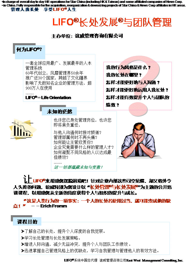 20几年外企从业经验,为其积累了大量人事管理实战经验,使其LIFO课程更具实用性和生动性,引起学员的强烈共鸣与好评!