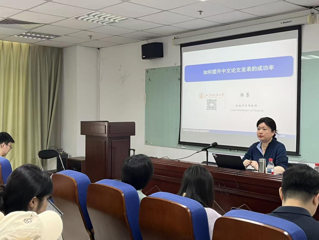 讲座伊始,胡老师向同学们介绍了陆蓉教授在学术领域及学术期刊建设方面的深厚造诣,并对教授的到来表示了热烈欢迎。陆蓉现为上海财经大学金融学讲席教授、二级教授,同时兼任中国人文社会科学期刊评价专家委员会主任,著有《陆蓉行为金融学讲义》等著作。在讲座中,陆蓉教授结合丰富的发表与审稿经验,从选题判断、写作避坑到投稿技巧,详细为大家拆解了一篇好论文到底是怎么“炼成”的。在讲解如何判断论文价值时,陆蓉教授以几个具体的论文选题进行示例,讲述了如何让自己的论文“骨骼”清晰明了,并提出一篇文章要写好,组织架构必须达到科学性、简约性及清晰性。同时,在阐述选题失败的几个常见问题时,教授还利用“铃声与跳舞”事例,生动形象地讲解了如何处理论文的内生性问题。